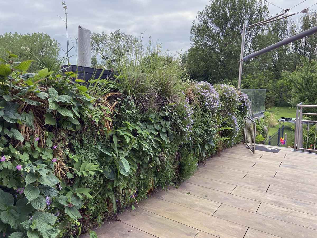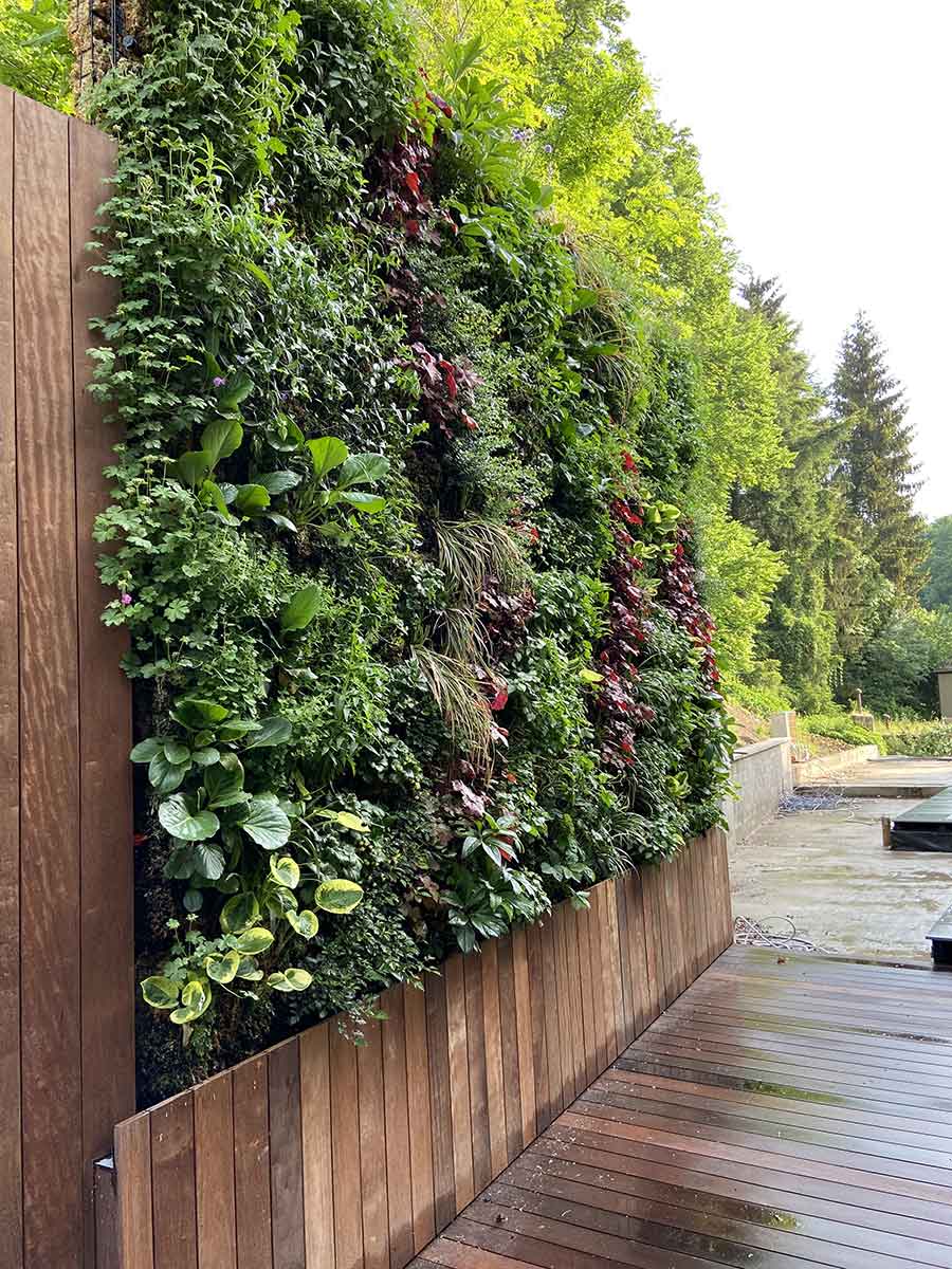 - Murs végétaux extérieurs, résistants aux intempéries et aux contraintes climatiques.
